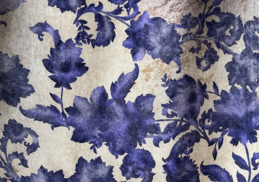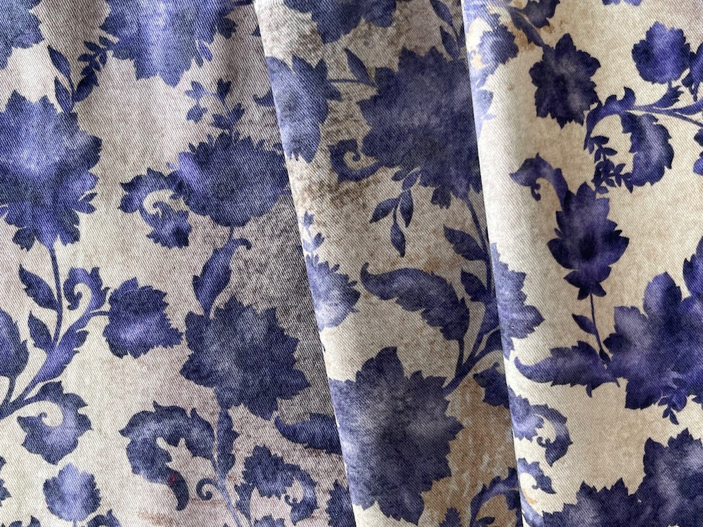 A stretch cotton twill in print of indigo plum foliage silhouettes on a gently mottled beige background - with a hint of lycra for comfort, this twill is perfect for a straight shirt, a summer dress, a light-weight jacket, or pants. Made in Italy. 98% cotton and 2% lycra. 54" wide.