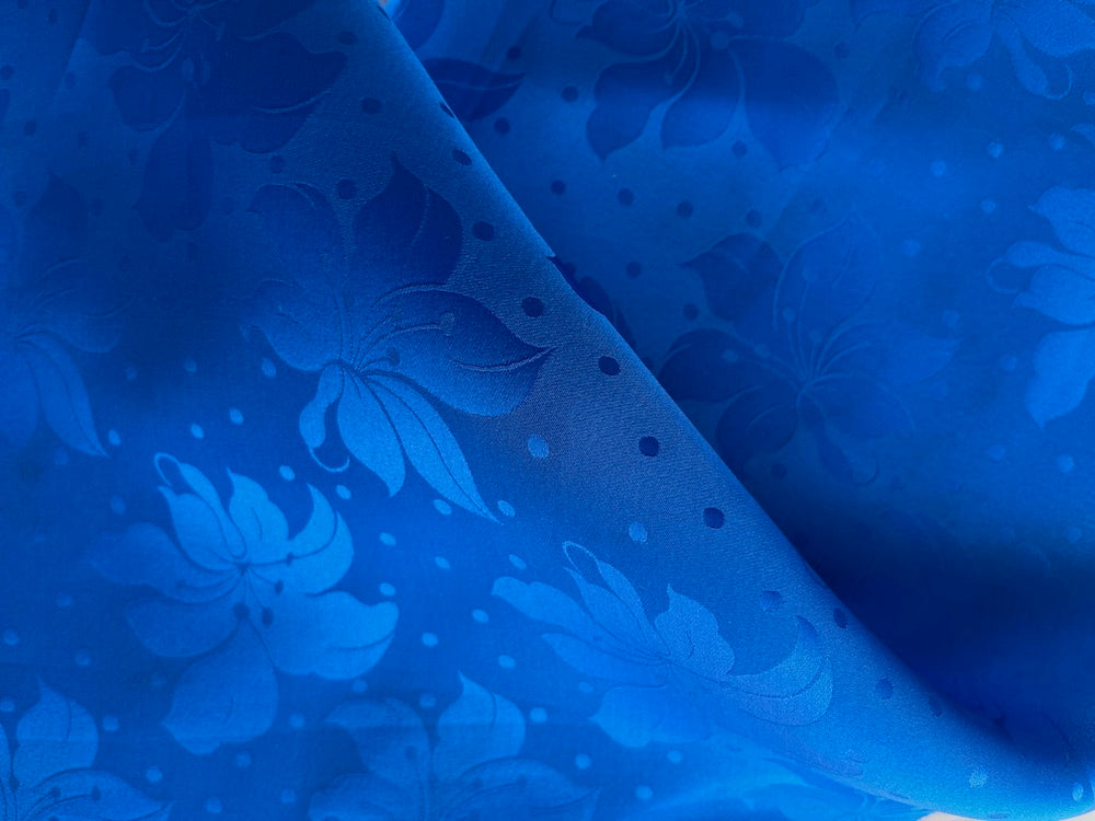 A semi-sheer silk organza jacquard in intense vibrant royal blue, in a tone-on-tone pattern of day lilies and polka dots - this brilliantly colored organza is perfect for a dressy blouse, a full holiday skirt, or an eye-catching wrap. Made in Italy. 100% silk. 45" wide.