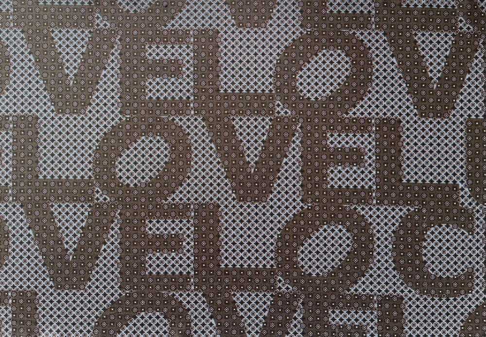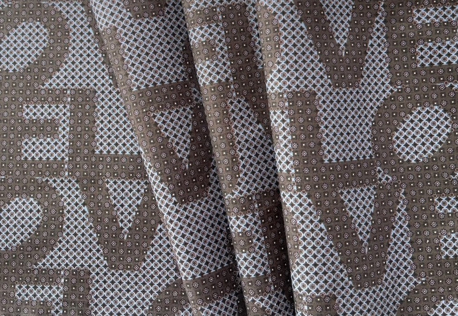 A high-end, light-weight cotton lawn in a foulard print of "LOVE" text in shades of milk chocolate, smoke, and pale blue - this tightly-woven, airy cotton lawn is perfect for a blouse, a vintage-style dress, or a gathered skirt. Made in Italy. 100% cotton. 58" wide.
