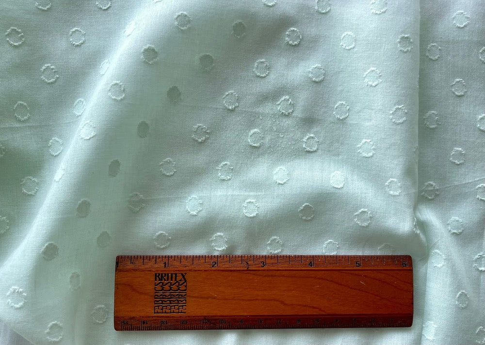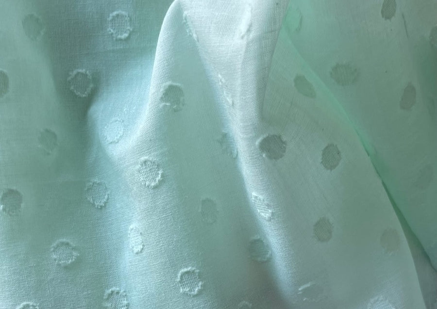 A light-weight cotton that's embroidered with a design of tone-on-tone polka dots in party mint green - this airy, charming eyelet fabric is great for a flirty full skirt, a tiered sundress, casual curtains, or summer shorts. Made in Italy. 100% cotton. 60" wide.
