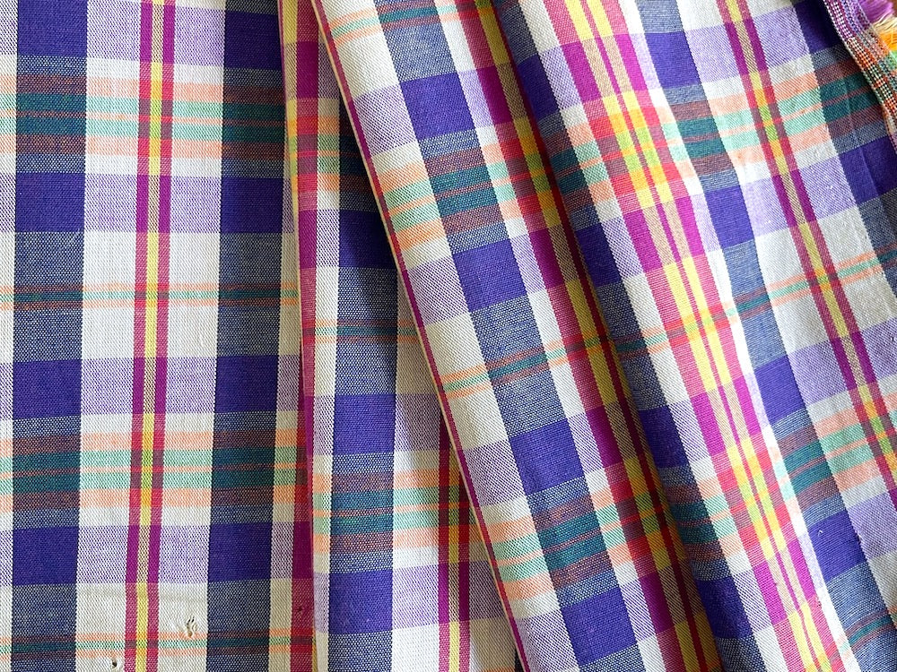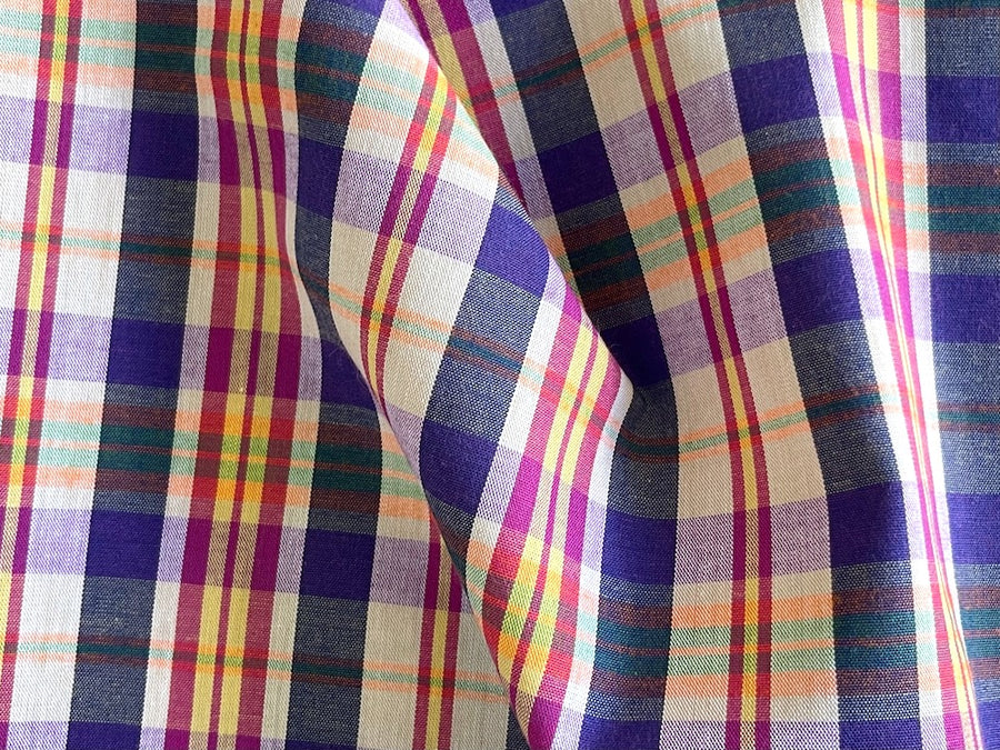 A light-weight cotton mock madras plaid in indigo violet, cerise, canary, light apricot, pistachio, and white - this soft, handsome plaid is perfect for gathered skirts, shorts, shirts, or duvet covers. Made in Italy. 100% cotton. 59" wide.