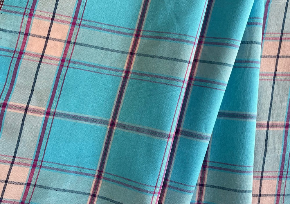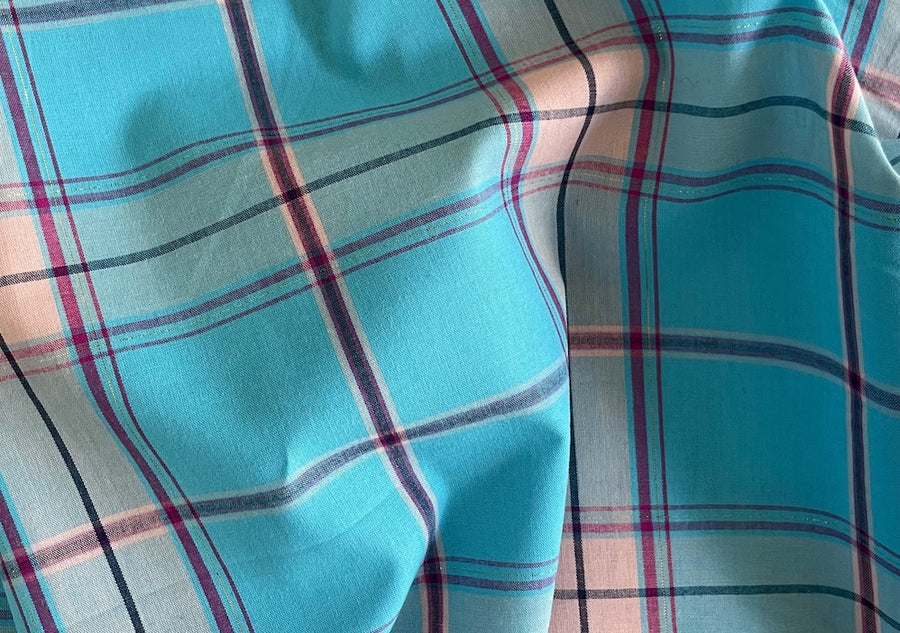 A light-weight cotton plaid in summery shades of turquoise, peach sherbet, and cerise and with a subtle gold metallic accent thread - this soft plaid is perfect for the beach! Make a gathered skirt, shorts, shirts, a shift dress, or duvet covers. Made in Italy. 100% cotton. 58" wide.