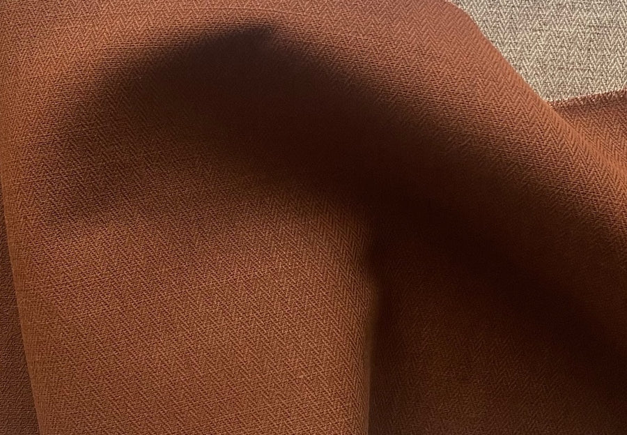 A high-end linen and cotton canvas in a herringbone weave and a dip dyed burnt copper - this elegant, tightly woven linen blend is perfect for handsome overalls, French chore jacket, culottes, or bags. Made in Italy by a luxury French fashion house. 60% linen and 40% cotton. 60" wide.