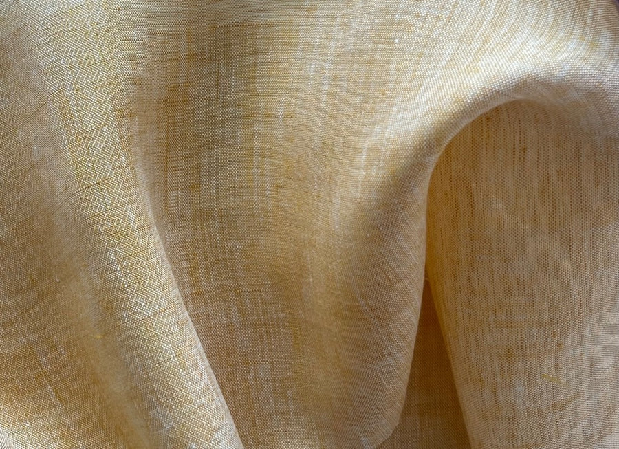 A high-end, mid-weight linen in a sophisticated shade of warm butterscotch creme - this couture shot linen is perfect for a blouse, a shirt, table linens, or a full skirt. Made in Italy by a luxury French fashion house. 100% linen. 60" wide.