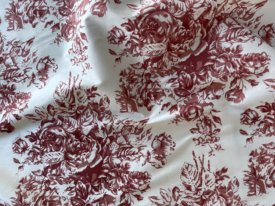 A crisp silk taffeta toile of mauve floral medallions on a sparkling white background - this light and airy silk is perfect for cushions, evening-wear, a coat, a vintage-style shirt-dress, or a hostess skirt. Made in Italy. 100% silk. 54" wide.
