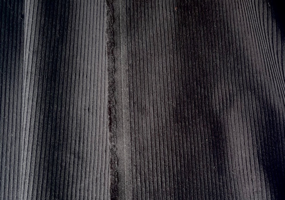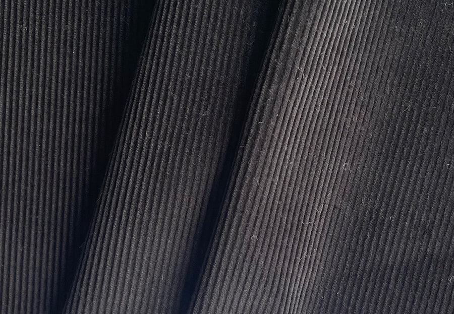 A high-end, mid-weight, mid wale cotton corduroy in onyx black - this handsome, beautifully soft corduroy is perfect for pants, trucker jackets, overalls, or skirts. Iron on the wrong side of the fabric and with the nap, or verso del pelo. A needle board can be utilized. Made in Italy. 100% cotton. 62" wide.