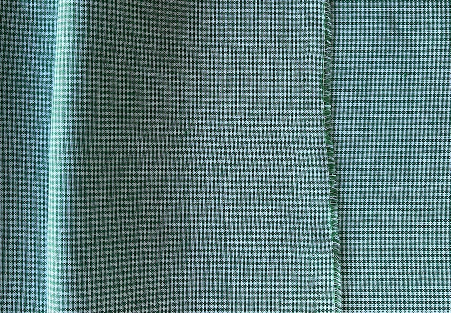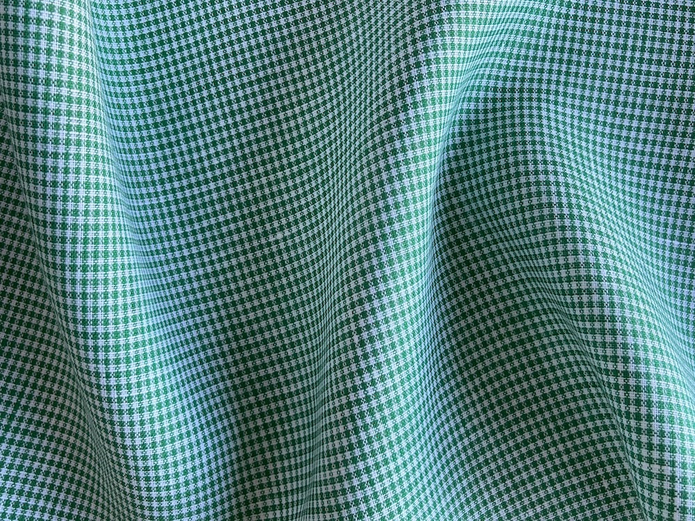 A mid-weight linen print in a delightful shamrock green and white micro-check - this summery, soft linen is perfect for dresses, tunics, table linens, or a shirt. Made in Poland. 100% linen. 60" wide.
