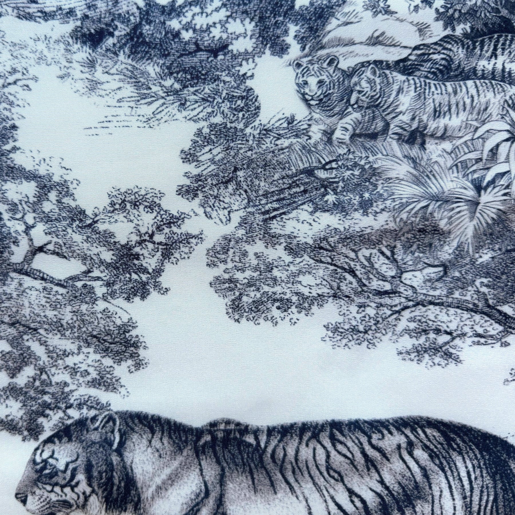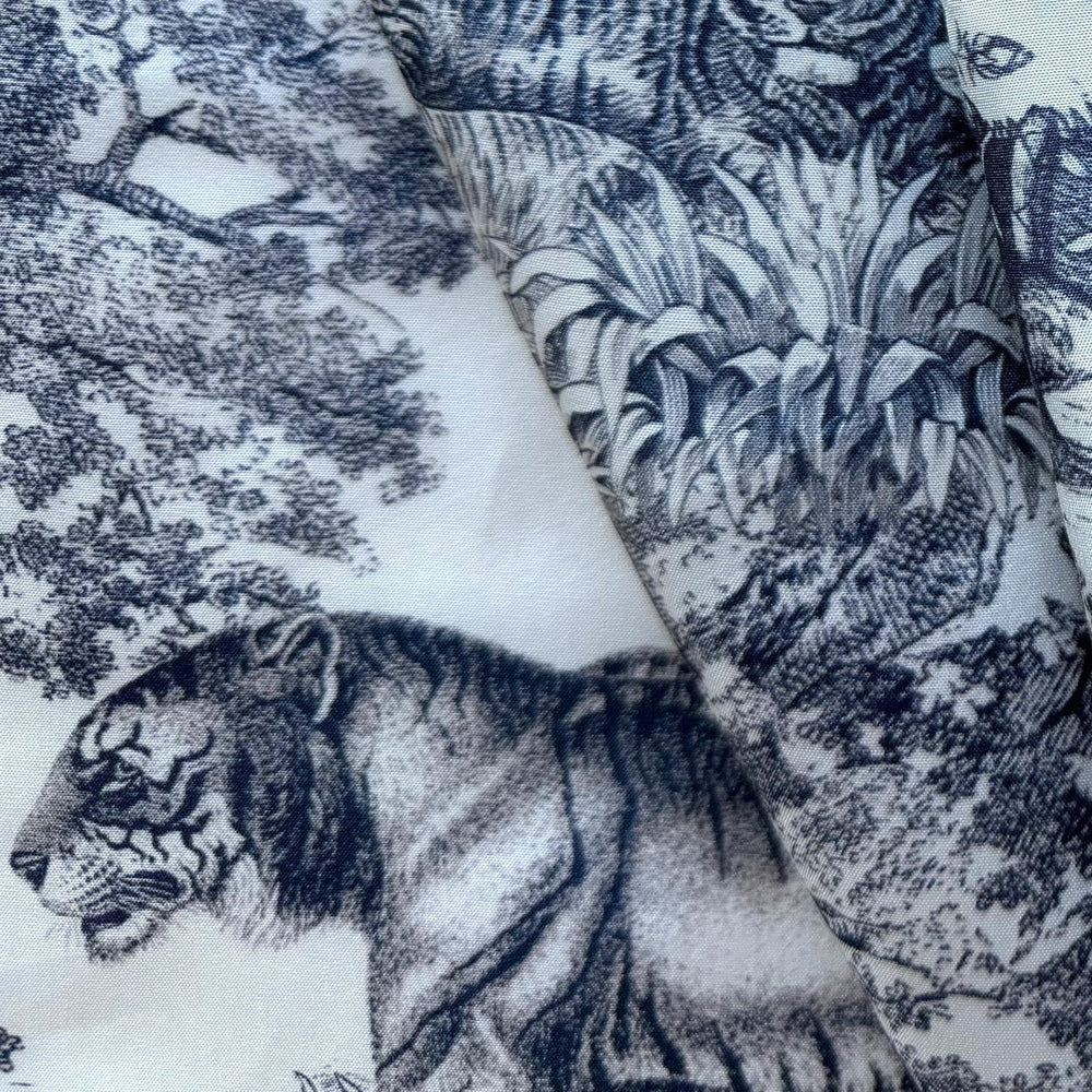 A mid-weight silk twill in a jungle themed toile with an ambush of tigers n indigo and white - perfect for dresses, blouses, robes, or wide-legged pants. Made in Italy. 100% silk. 58" wide.