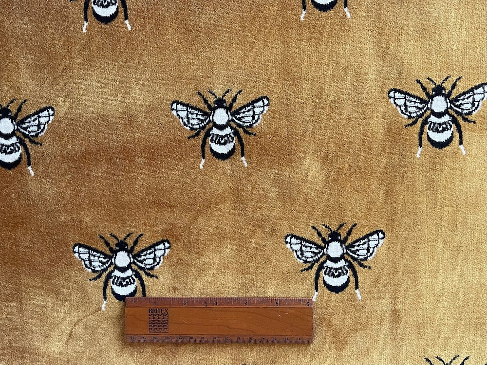A heavy-weight polyester blend upholstery velvet of black and white bees on a turmeric background - perfectly handsome for upholstery, headboards, chairs, and ottomans. 48% polyester, 42% rayon, and 10% cotton with a latex backing. 57" wide.