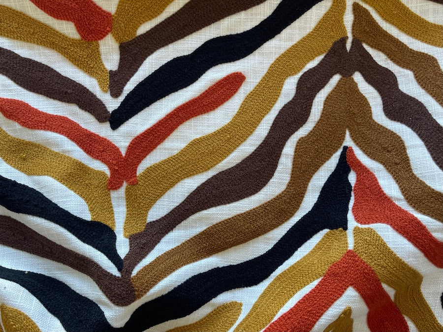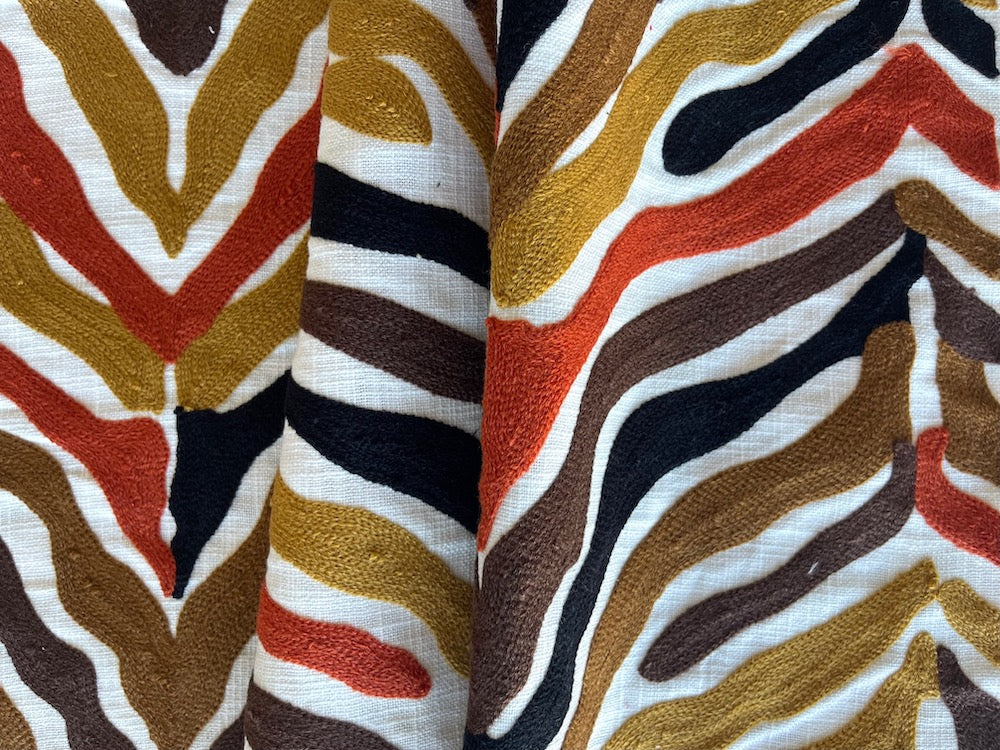 A Midcentury-inspired cotton blend upholstery fabric of autumnal-colored, crewel embroidered zebra stripes on a textured ivory background - in shades of amber, curry, walnut, cedar, and black, this tres moderne fabric would be handsome for upholstery, headboards, chairs, and ottomans. Cotton base with acrylic crewel embroidery. 59" wide.