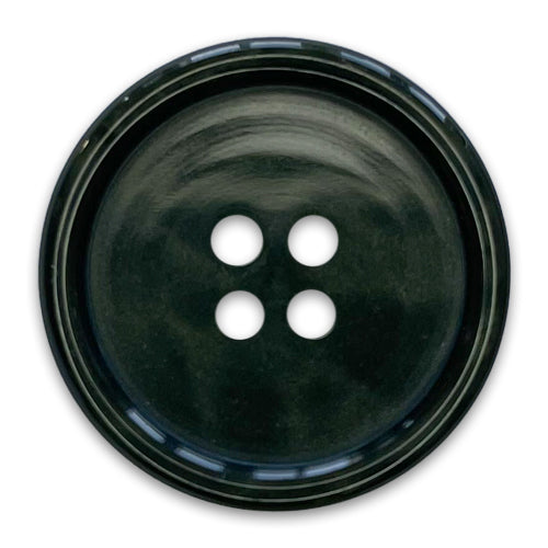 A 4-hole plastic button in midnight forest green and with a narrow raised rim. Made in Italy.