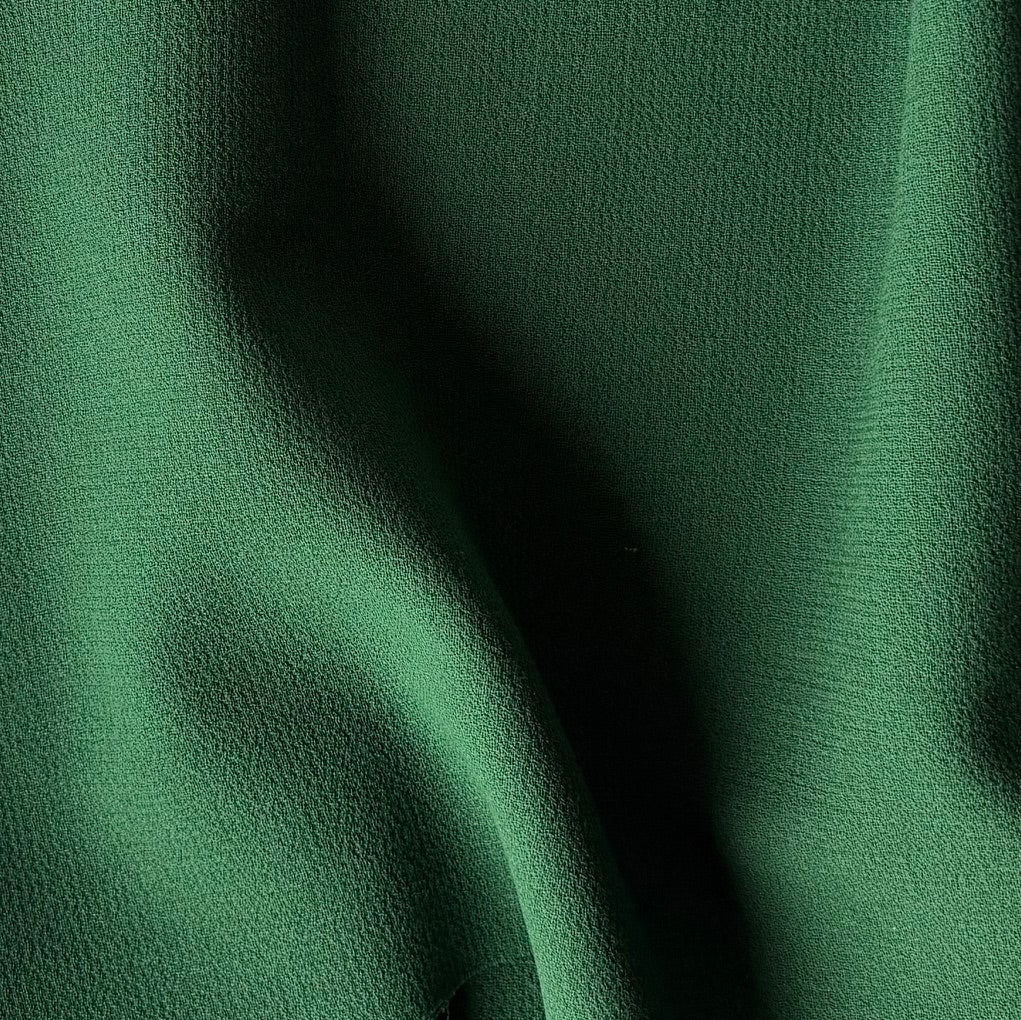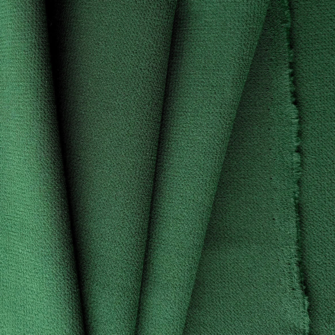 A slightly heavier wool crepe a lushly mysterious shade of forest green - with a classic pebbled texture, soft drape, and year-round wearability, this crepe is perfect for suits, travel-wear, jackets, dresses, shirts, slacks, and tops. Made in Italy. 100% wool. 58" wide.
