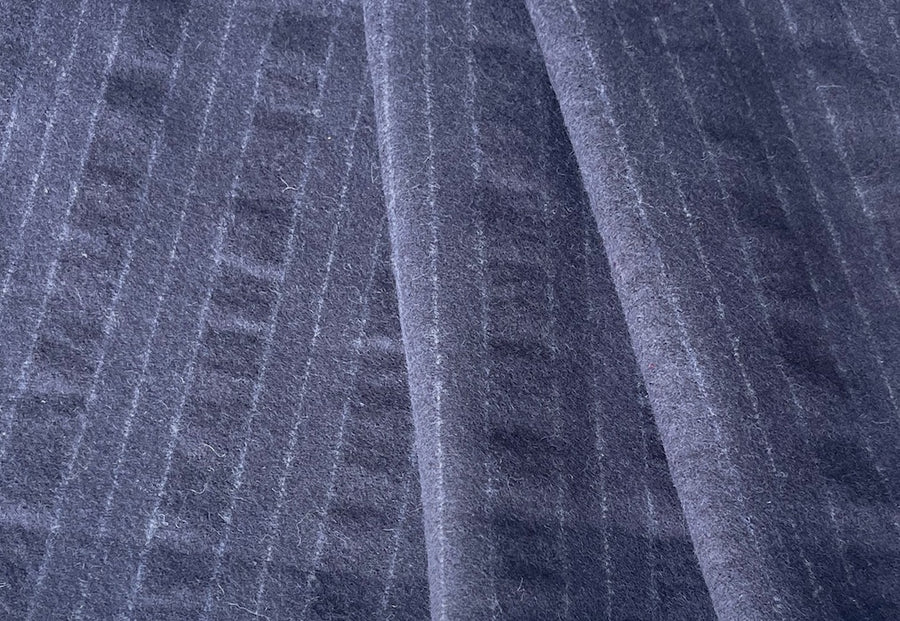 A washed, virgin wool flannel seersucker in inky navy with a lengthwise chalk white stripe - this unusual woolen flannel is perfect for culottes, a sheath dress, or a midi-skirt. Made in Austria. 100% wool. 62" wide.