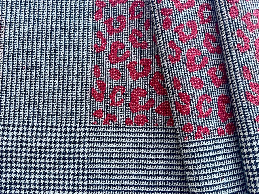 A unique embroidered virgin wool in a larger-scale obsidian and cloud white hounds-tooth "patchwork", embroidered with carmine leopard spots - this unusual woolen is perfect for an elegant sheath dress, a pencil skirt, or a dress coat. Made in Italy. 100% wool. 56" wide.