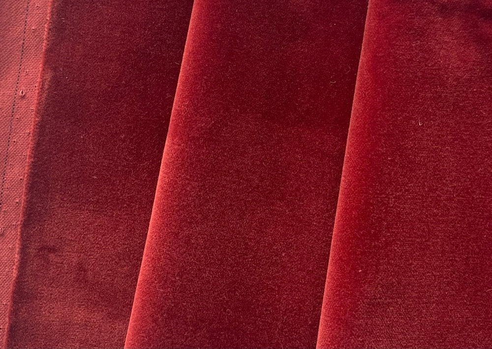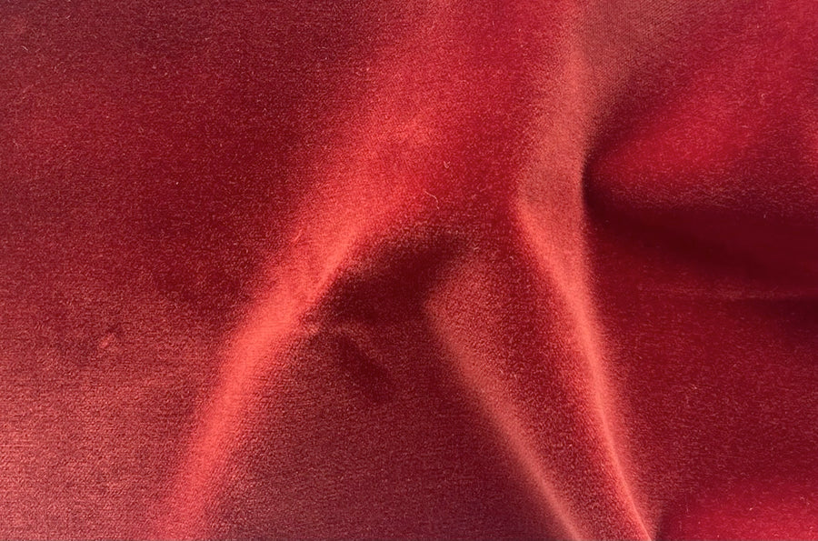 A plush, mid-weight cotton velvet in autumnal crimson clay - this delicious, pettable velvet is perfect for jackets, accent pillows, needlepoint backing, or holiday decor. Made in Italy. 100% cotton. 60" wide.
