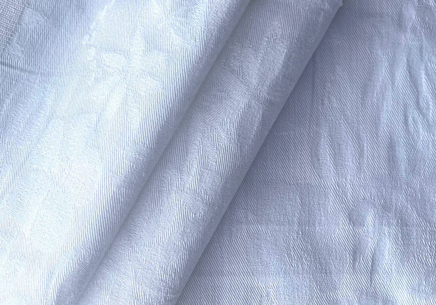 A stretch cotton twill damask in a sweet summer cloud white daisy design - with a hint of lycra for comfort, this cotton twill is perfect for a short straight skirt, cropped jeans, or a casual warm weather jacket. 96% cotton and 4% lycra. 58" wide.