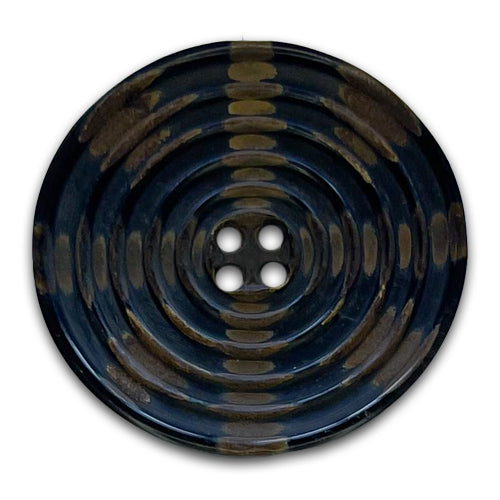 A 4-hole horn button in shades of mottled rich black coffee brown, with rows of raised concentric circles. Made in USA.
