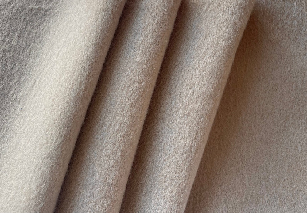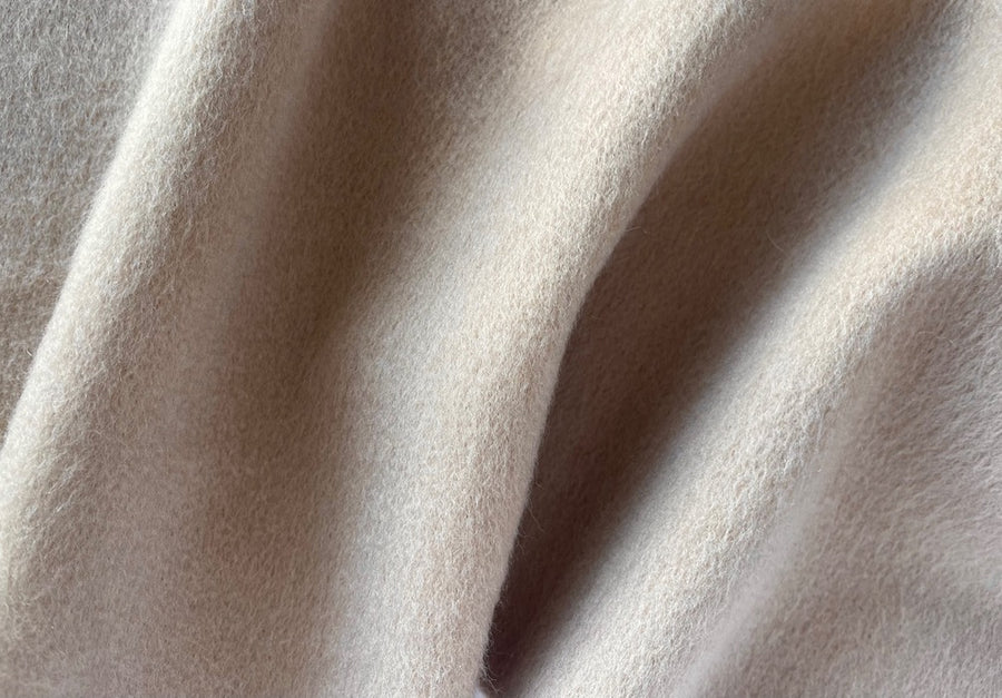 A drapey, mid-weight wool and cashmere coating in sandy camel - this tightly-woven, beautifully brushed woolen is perfect for a coat, a cape, or a heavier shirt jacket. Made in Italy. 70% wool and 30% cashmere. 60" wide.