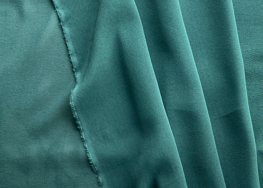 A semi-sheer stretch silk georgette in cool forest glade green - with a hint of lycra, this luscious, drapey silk is perfect for simple scarves, gathered skirts, translucent sleeves, or luxurious blouses. Made in Italy. 97% silk and 3% lycra. 56" wide.