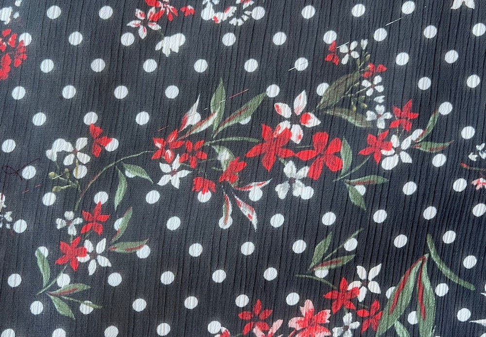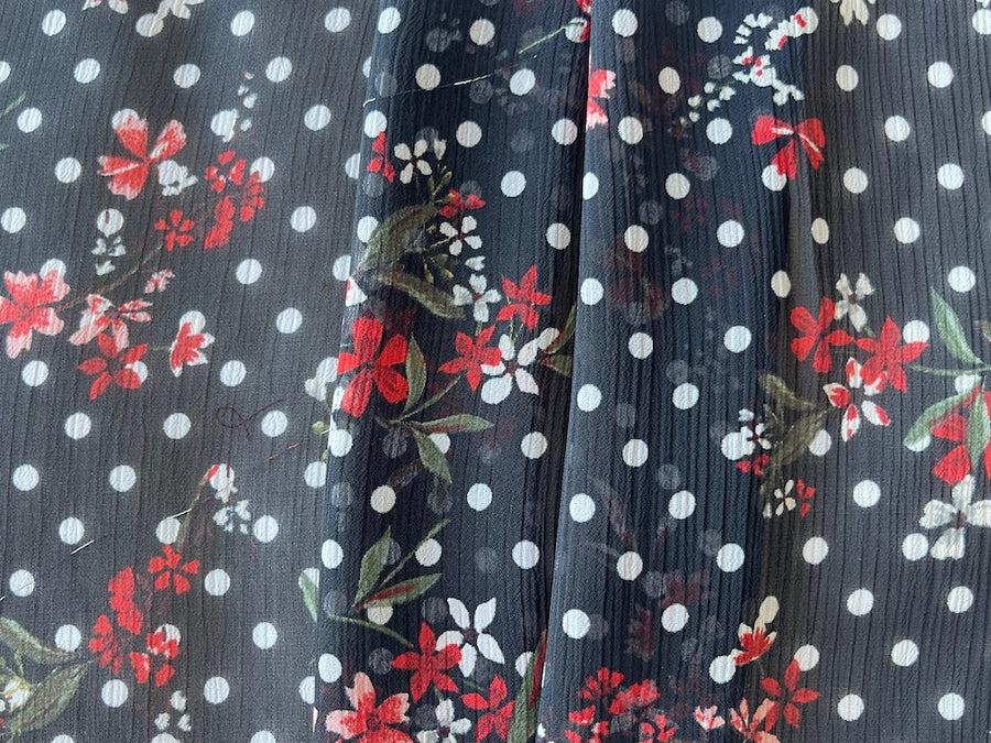 A semi-sheer crinkled polyester chiffon in a breezy print of delicate carmine flowers on a black and white polka dotted background - perfect for dresses, skirts, blouses, or scarves. Made in Italy. 100% polyester. 57" wide.