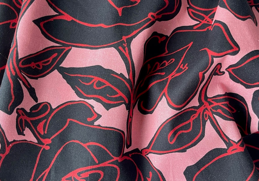 A stretch cotton floral with oversized red and black flowers on a salmon pink background - with a touch of lycra, this smooth cotton is perfect for blouses, sundresses, or slim capris. Made in Italy. 97% cotton and 3% lycra. 60" wide.
