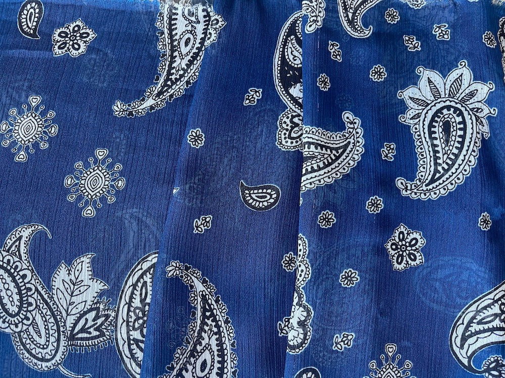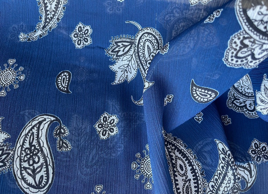 A semi-sheer crinkled polyester chiffon in black and white paisley print on a luminous sapphire blue background - perfect for a carefree scarf, an easy-going wrap, or a full tiered dress. 100% polyester. 58" wide.