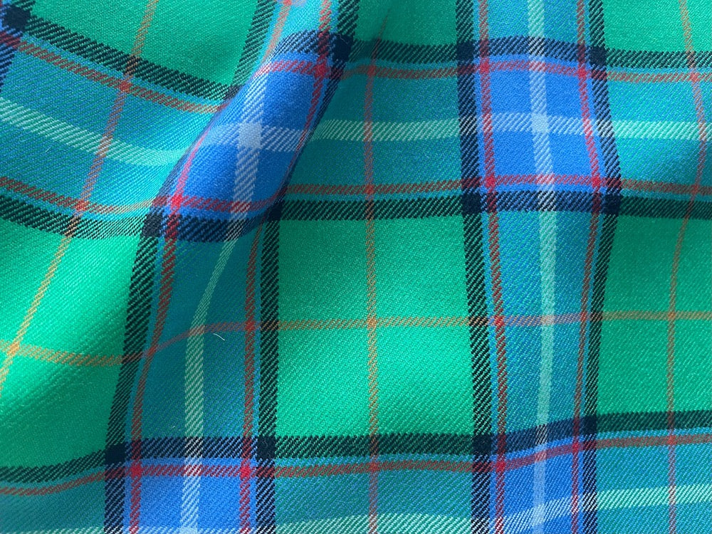 A virgin wool tartan plaid in vivid shades of sea green, bright denim, and black - smooth, tightly-woven woolen is perfect for a kilt, a board shirt, or a tailored dress. Made in Italy. 100% virgin wool. 61" wide.