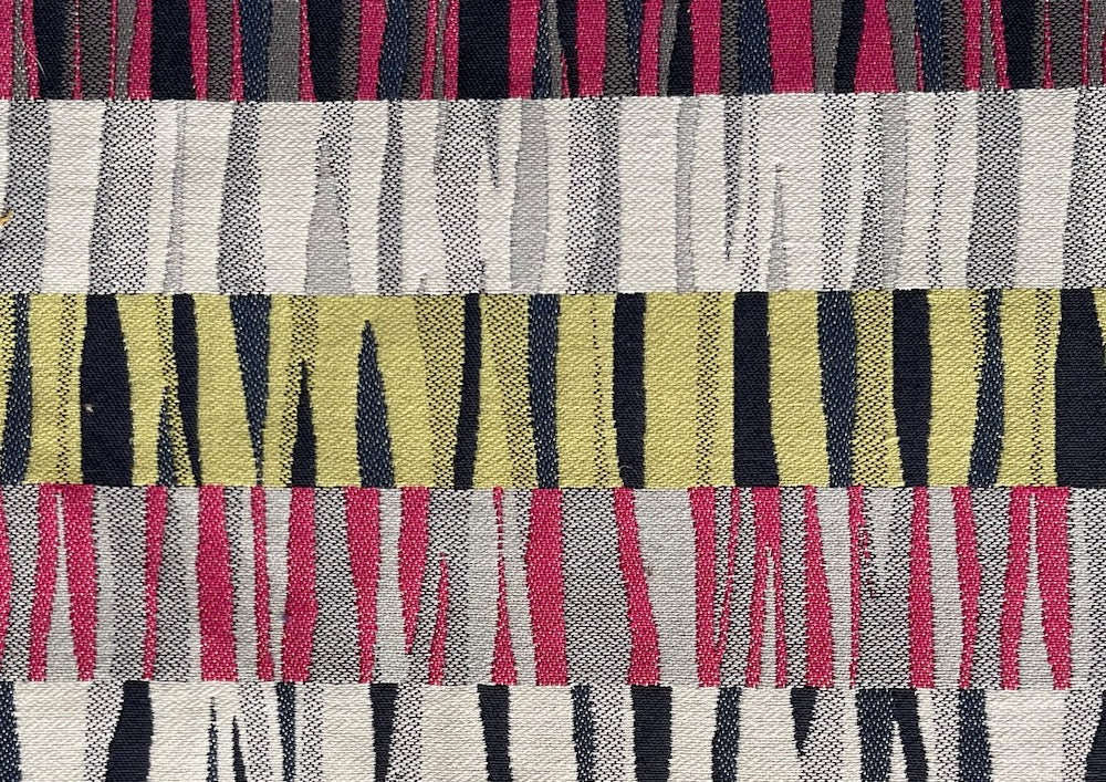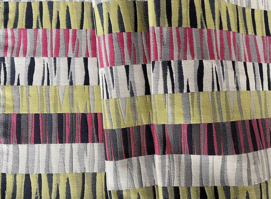 A mid-weight rayon blend fabric with crosswise stripes of tiger patterned bands in kiwi, French pink, ivory, dove grey, and soft black - modern and sturdy, this fabric is perfect for upholstery, accent pillows, drapes, window-seats, sofas, or headboards. Cotton, polyester, and rayon. 58" wide.