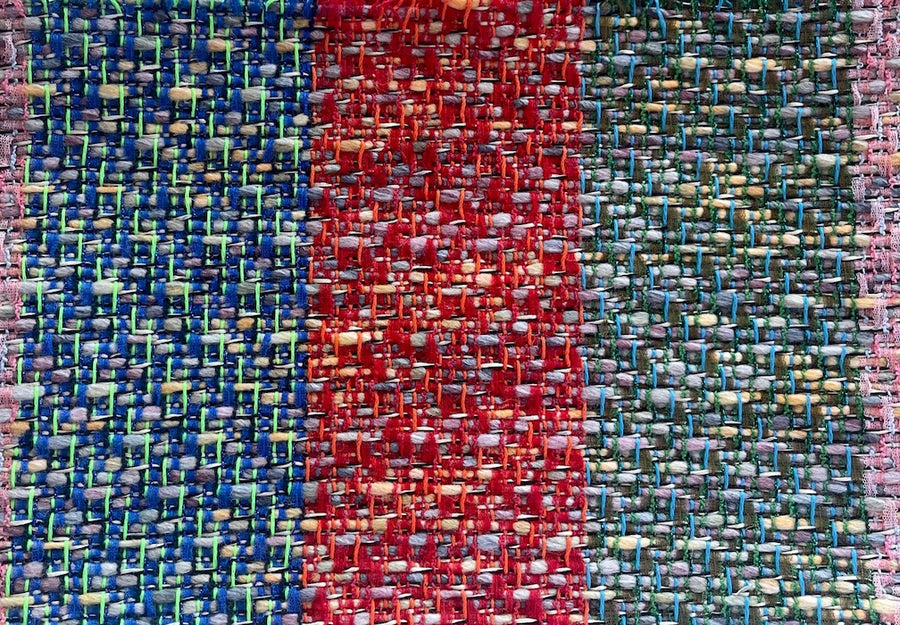 A fringeable woolen blend bouclé of 4" crosswise stripes in eye-catching shades of scarlet, wintergreen, mauve, and ultramarine - this bold 'n brash, loosely woven bouclé is perfect for a terrific long fringed coat, a loose tunic top, or a striking wrap Made in Italy. Wool, acrylic, and polyester. 58” wide.