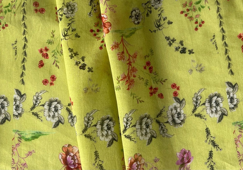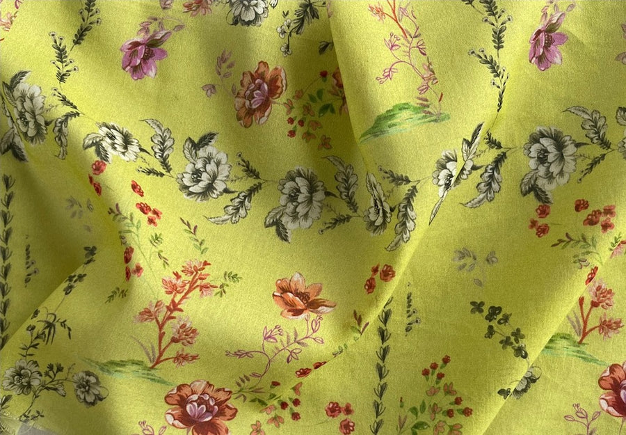 A high-end, semi-sheer cotton voile in a delicately diaphanous print of tumbling summer meadow flowers on a Jonquil yellow background - this soft, airy voile is perfect for chic lounge-wear, palazzo pants, or a romantically boho over-shirt. Made in Italy. 100% cotton. 58" wide.