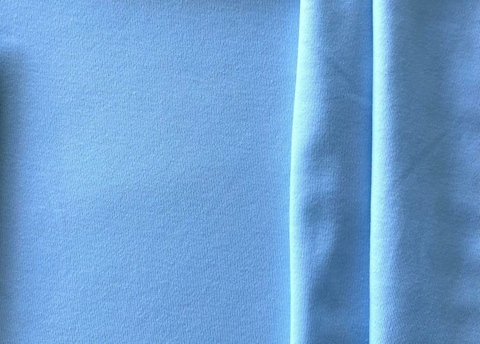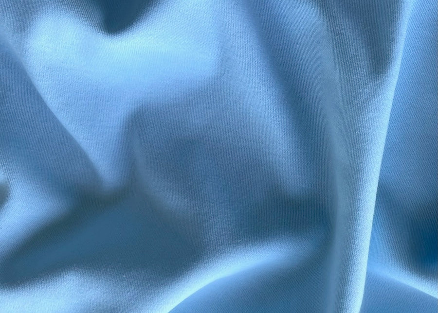 A high-end cotton knit in a sweet shade of summer sky blue - with a hint of lycra, this smooth knit is a tad heavier and great for tops, pajamas, or children's rompers. Made in Italy. 100% cotton 58" wide.