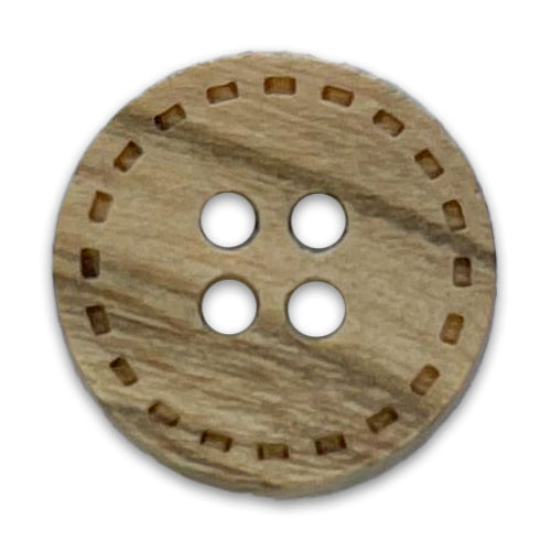 A flat 4-hole wood button, with an embossed "top stitch" edging.