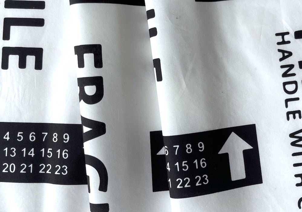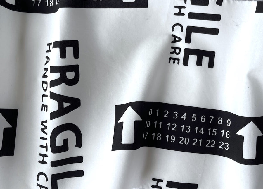 A high-end, mid-weight cotton poplin in a typographic print of black shipping labels on a bright white background - with a high thread count, this delightfully smooth cotton poplin is perfect for a shirts, gathered skirts, or duvet covers. Made in Italy. 100% cotton. 590" wide.