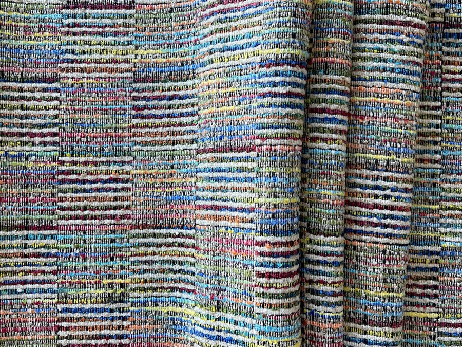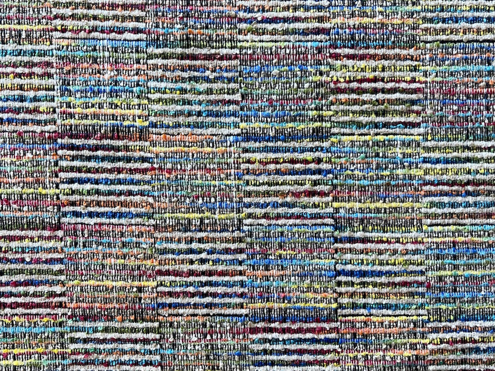 A polyester upholstery fabric in a tweedy rail fence pattern in shades of denim, lemon, salmon, raspberry, mandarin, limeade, and natural - soft and durable, this rustic textured fabric would be handsome for upholstery, headboards, chairs, and ottomans. 100% polyester. 55" wide.