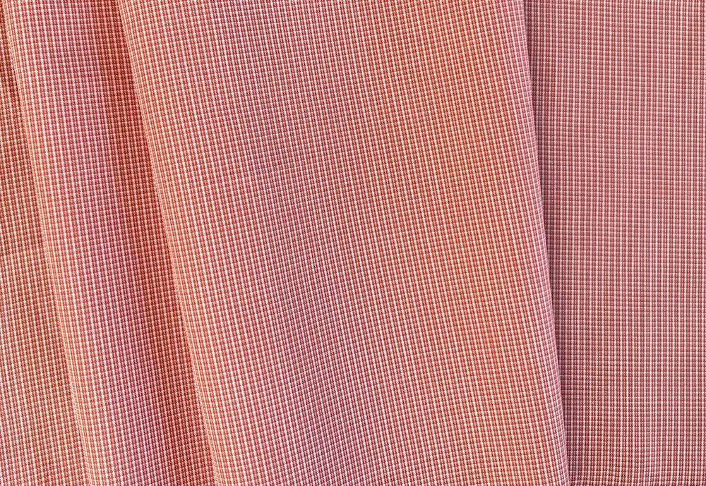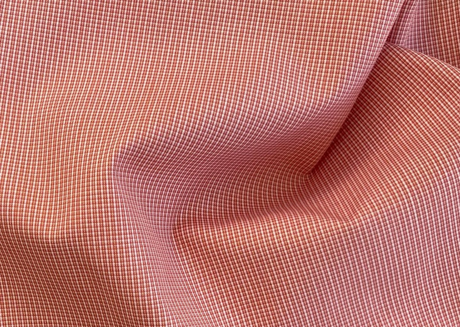 A pima cotton shirting in a sweet vermilion and porcelain micro-check plaid - this buttery soft shirting is perfect for bespoke shirts, bed linens, or blouses. Made in Italy. 100% cotton. 60" wide.