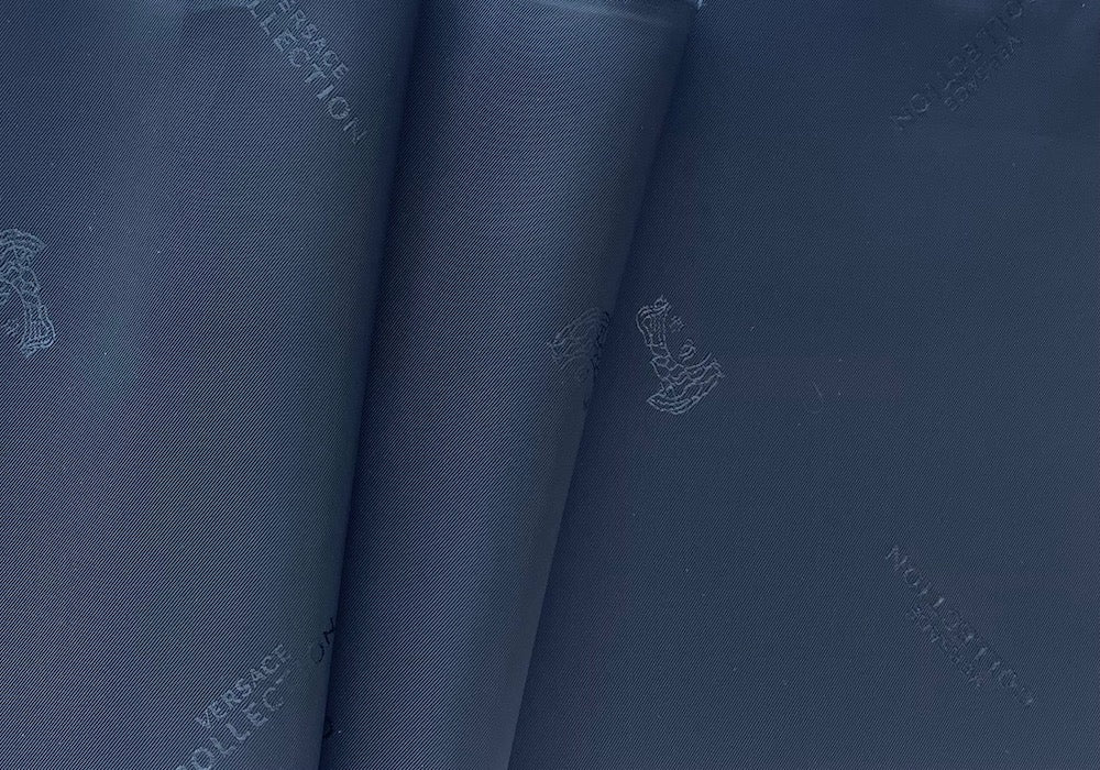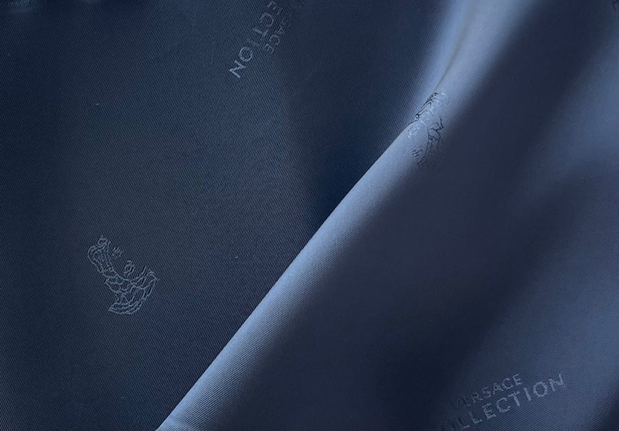 Versace passport navy blue rayon bemberg twill jacquard lining adorned with the signature Versace logo and "VERSACE COLLECTION". Rayon Bemberg linings are our favorite lining for all fabrics including silk, wool, and linen. They're cool to the touch, smooth, non-cling, and cold water washable. Made in Italy for Versace. 100% rayon viscose bemberg. 56"wide.