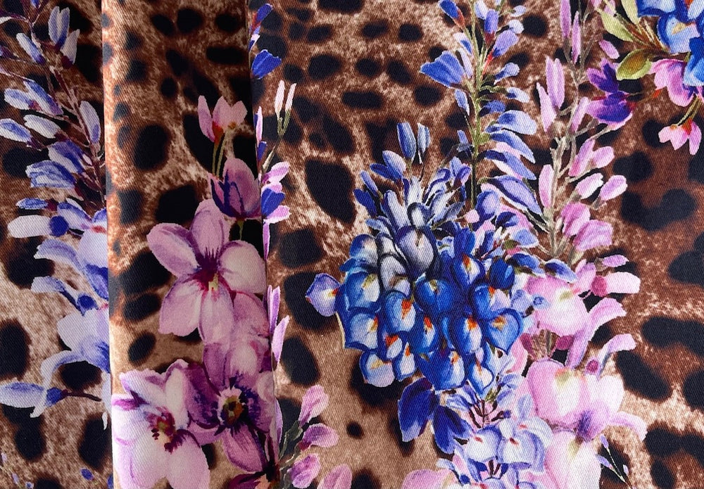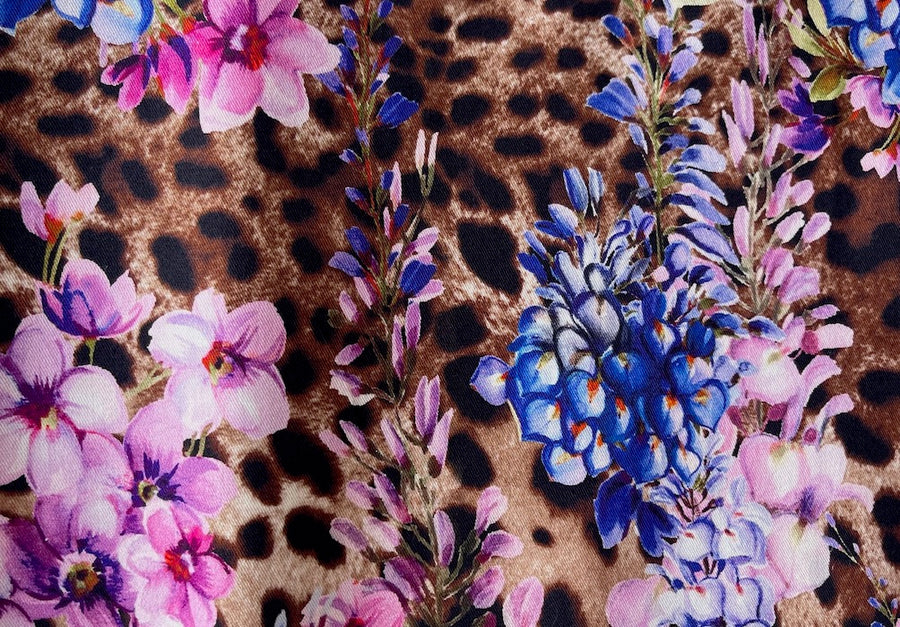 A stretch cotton sateen in a print of vivid tropical blooms on a cheetah background in shades of coffee - with a hint of lycra for comfort, this wonderful mid-weight sateen is perfect for a straight shirt, a summer dress, or cropped pants. Made in Italy. 98% cotton and 2% lycra. 54" wide.