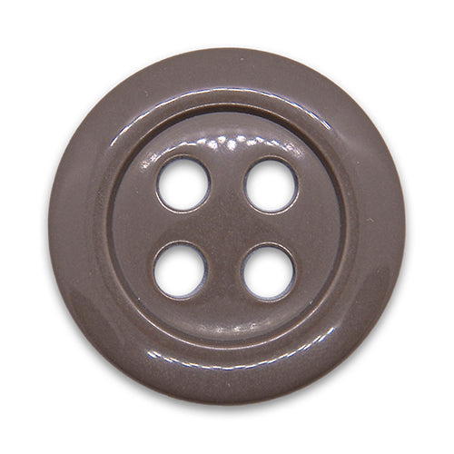 1 1/2" 4-hole glossy taupe plastic button with a raised rim and large buttonholes.