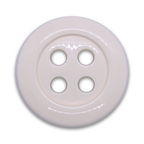 1 1/2" 4-hole glossy white plastic button with a raised rim and large buttonholes.