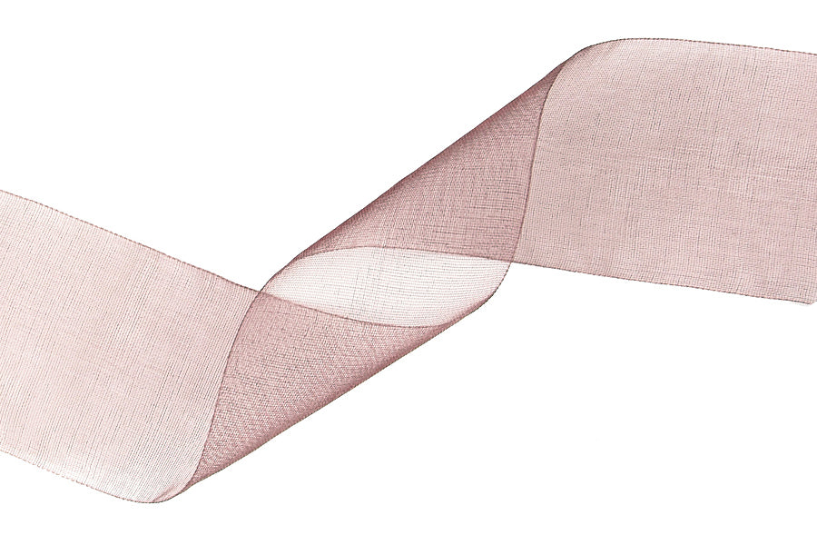 1 1/2" wide darkest rosy taupe Azuki sheer ribbon, made of an airy and drapable sheer organdy. 100% Nylon.