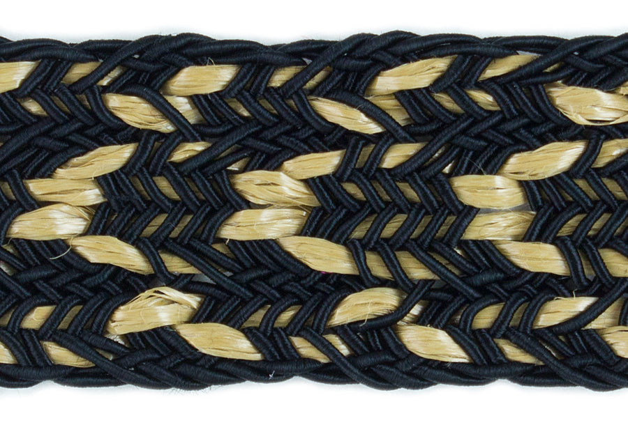 1 1/2" wide braided trim in black with beige raffia accents. This trim is perfect for sewing haute couture garments such as French designer-inspired jackets - layer your trims for a unique and special look!