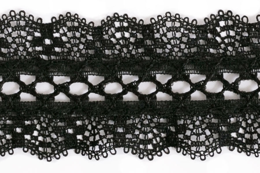 1 1/2" wide ruffled lace trim in black. Although this is not a true beaded lace trim, it would be easy to thread 1/8" wide satin ribbon through the center holes for an added colorful accent. This trim is not elasticized.
