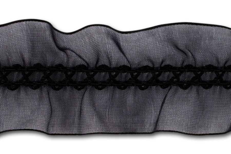 1 1/2" black sheer gleaming organza double ruffled elastic, with two center rows of elastic thread sewn on with decorative stitching . Made in England.