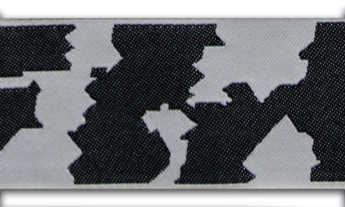 1 1/2" wide woven ribbon in a black and white cow design. LIMITED STOCK.