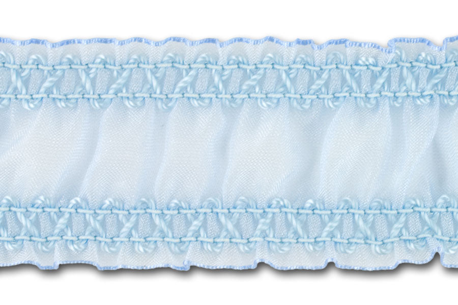 1 1/2" light sky blue sheer gleaming organza delicately ruched elastic, with a top and bottom double row of elastic thread sewn on with decorative stitching. Made in England.