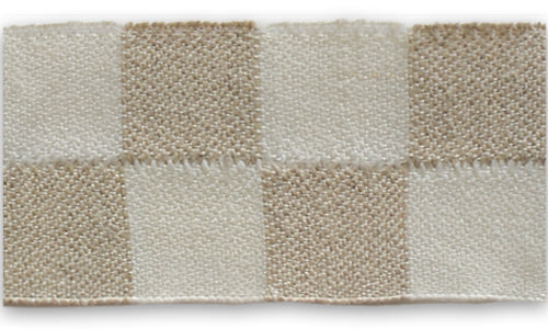 1 1/2" wide woven linen ribbon in a tan and natural checkered pattern. Made in Germany.