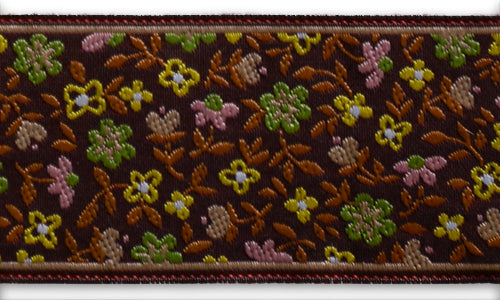 1 1/2" wide woven ribbon in design of sweet, tiny pink, sage, and yellow flowers on a rich espresso background. LIMITED STOCK.