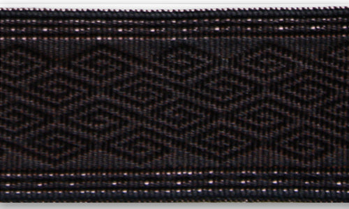 1 1/2" wide woven brocade ribbon in a pale pink and black geometric pattern. Made in Austria.