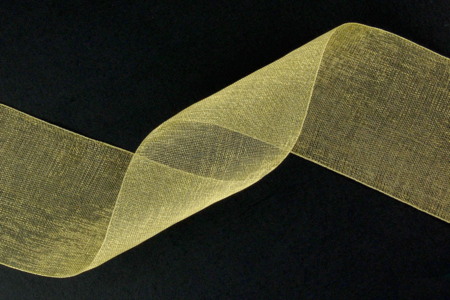 1 1/2" wide golden yellow sheer ribbon, made of an airy and drapable sheer organdy. 100% Nylon.