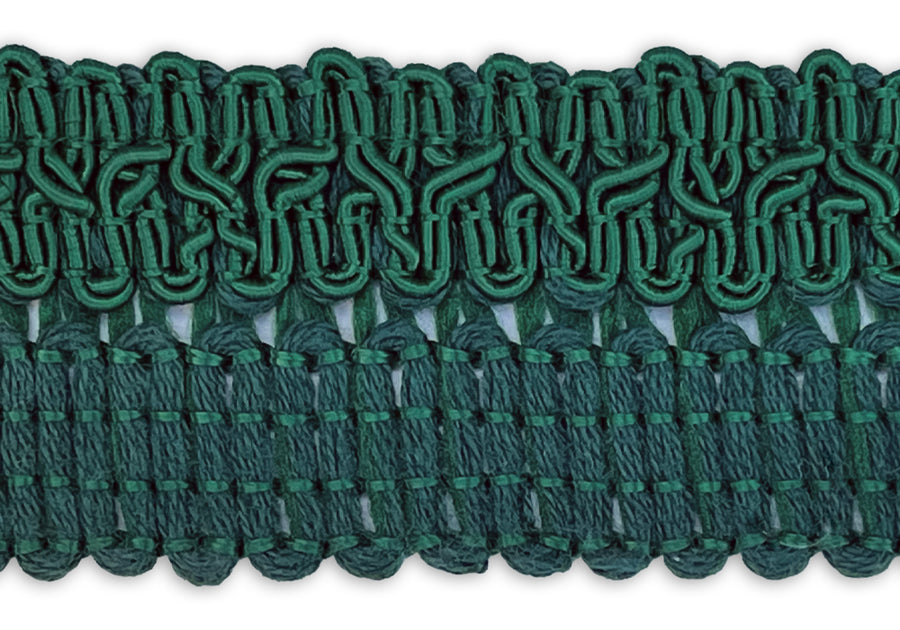 1 1/2" wide polyester fold-over gimp trim in hunter green, with decorative gimp on one half and regular braid on the other half. This trim is perfect for sewing haute couture garments such as French designer-inspired jackets - layer your trims for a unique and special look! 100% polyester. Made in Germany.
